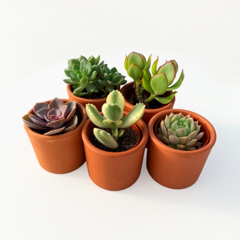 Le lot comprends : - une sélection de 5 plantes succulentes variées, sélectionnées par nos soins le matin même de l'envoi. - 5 Petits pots en terre cuite spécialement conçus pour accueillir vos mini plantes succulentes.