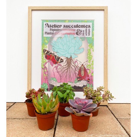 Cette illustration a été pensée pour parler de la beauté de l'Echeveria Runyonii 'Topsy Turvy' et de l'Écaille chinée, une espèce protégée de papillon, présent sur le site de notre pépinière de Juillet à Septembre. Dessinée en Illustration Digitale sur tablette graphique, elle a été imprimée sur papier couché 170g avec effet Mat dans une imprimerie Française labellisée Imprim'vert. Notre papier est issu à 95% de forêt gérées durablement.