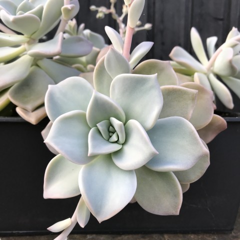 Superba pianta che forma grandi rosette ricoperte da una pregiata pruina bianca. Ibrido di Graptopetalum 'Purple Haze' e Echeveria laui. Porto in caduta. Facile da coltivare.