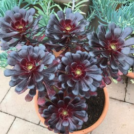 Eine Sorte von Aeonium arboreum var. atropurpureum. Sehr dunkles, fast schwarzes und glänzendes Laub. Dieser Strauch kann bis zu 80 cm hoch werden. Perfekt für die Topfkultur geeignet