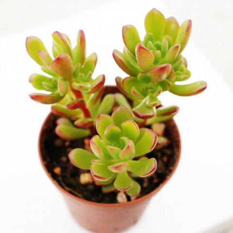 Sedum 'Joyce Tulloch' ist ein schönes kleines Sedum mit roten Stielen mit schönen Rosetten von hellgrünen Blättern, die stark in der Sonne klingen. Weiße Blumen im Frühling