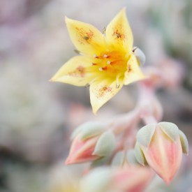 Graptopetalum paraguayense X Echeveria derenbergii. Rosetten liegen sehr schnell, um sehr breite Tufts zu bilden. Gelbe Blumen.