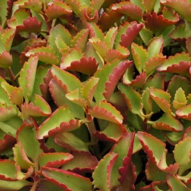 Kalanchoe mit Laub, die außergewöhnlich rote Farben einnimmt, wenn es in trockener Lage ist, das ist während einer guten Trockenheit oder in einem Substrat, das beruhigt hat. Seine gelbe Frühlingsblume auf langen Stielen gut über dem Blatt ist ebenso schön.