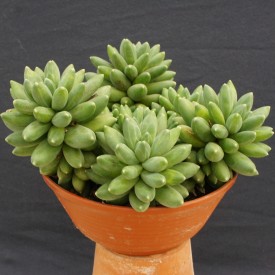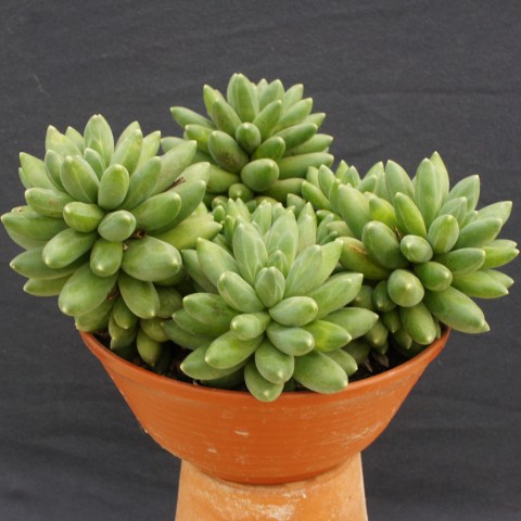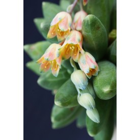 Sehr kompakter, kleiner Busch. Grüne marmorierte konische Blätter, rosa und gelbe Blüten.