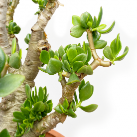 Un arbusto de forma robusta muy similar a Crassula ovata, con follaje verde suave.