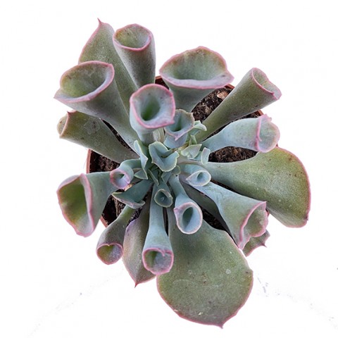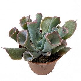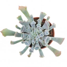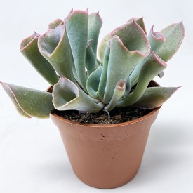 Espectacular y original, Echeveria 'Trumpet Pinky' no se asemeja a ninguna otra Echeveria. Heredó esta forma monstruosa por la hibridación de Echeveria Cante y Echeveria shaviana. Sus hojas tienen una forma tubular muy marcada. Bien expuesto al sol que toma en tonos rosas absolutamente magníficos. Generoso, produce fácilmente descartes, pero disfrutará de los riegos bien seguidos.