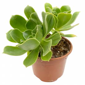 Aeonium au port arbustif pouvant atteindre 1 ou 2 m de hauteur. Très proche d'Aeonium arboreum, se distingue par son feuillage plus pale et l'extrémité de ses feuilles plus pointue.