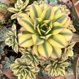 Un 'Must Have', les variations de couleurs de ce petit arbuste sont juste tellement lumineuses. Panaché de blanc crème en hiver virant au jaune vif en été, et s'ourlant de rouge au soleil, difficile de passer a coté sans le remarquer. Nous on l'aime en toutes circonstances, dans une belle potée en terre cuite ou en composition avec quelques sedum tapissants, ou quelques Graptosedum aux couleurs contrastées, il a toujours cette allure distinguée et remarquée.