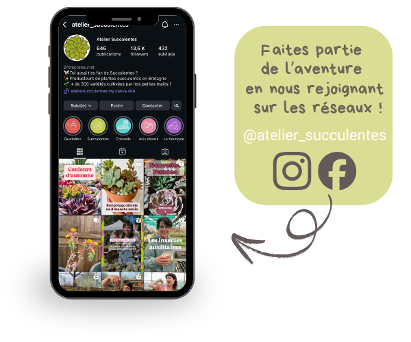 Suivez Atelier Succulentes sur Instagram et Facebook pour découvrir chaque jour du contenu ludique et éducatif autour de mes succulentes. Vous y trouverez des idées de compositions originales, des conseils d’entretien, ainsi que des tutoriels pratiques pour vous aider à concevoir et entretenir vos jardins intérieurs. C’est également l’endroit où nous partageons avec vous toutes les nouveautés, les temps forts de la pépinière, et l’évolution de la collection au fil des saisons. Ne manquez rien et inspirez-vous au quotidien en rejoignant notre communauté passionnée !