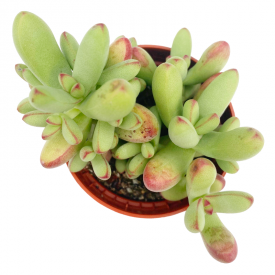 Forme une petite touffe. Feuilles rondes et épaisses, vertes avec un liseré rouge.