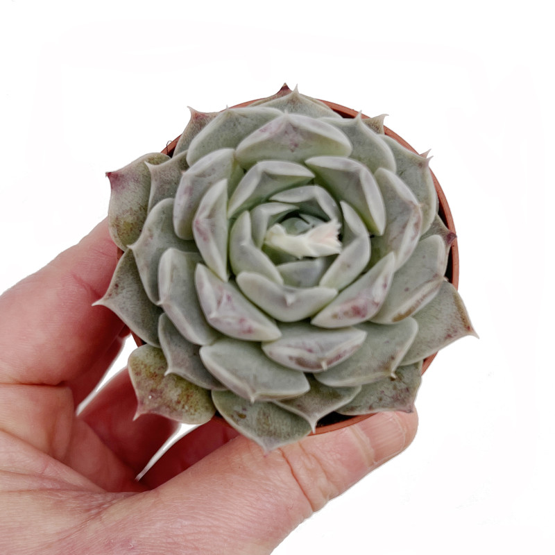 Joli petit bijou, Echeveria hyalina forme une rosette bien compacte et régulière, ses feuilles sont courtes, épaisses, et régulièrement disposées pour former une rosette bien ronde aux couleurs bleues gris, parfois teintées de roses avec le soleil.