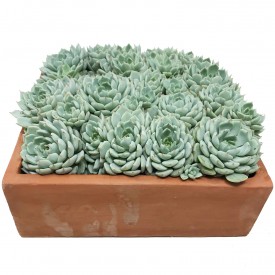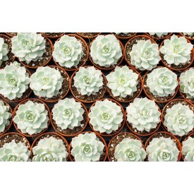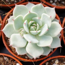 Résistant et facile d'entretien, cet Echeveria forme un joli coussin plat et compact avec de multiples petites rosettes bleu pâle sur 20 cm de diamètre. Sa structure très compacte lui fait redouter l'humidité l'hiver lorsque les températures baissent au dessous de 10°C, il faudra alors le tenir bien au sec, quite à l'assoiffer et voir son feuillage ramolli s'il est cultivé en serre froide. Il reprendra sa superbe aux beaux jours avec l'arrivée de températures plus clémentes qui permettrons les premiers arrosages.