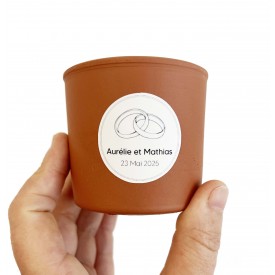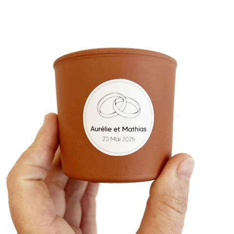 Je vous propose ce modèle d'étiquette pré-personnalisé sur pot en terre cuite. Indiquez-moi le prénom des mariés ainsi que la date du mariage et offrez un souvenir unique.