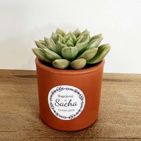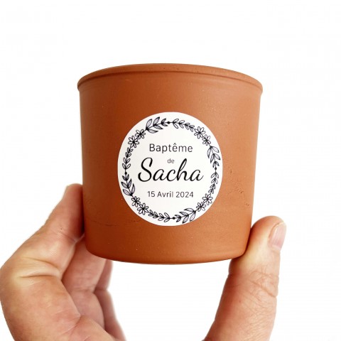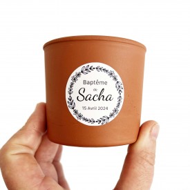 Je vous propose ce modèle d'étiquette pré-personnalisé sur pot en terre cuite. Indiquez-moi Le prénom de l'enfant ainsi que la date de son baptême et offrez un souvenir unique.