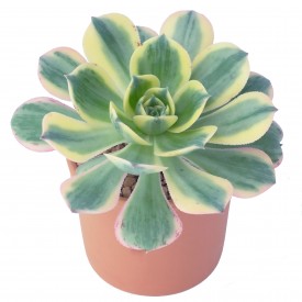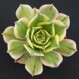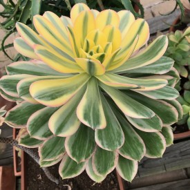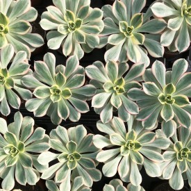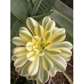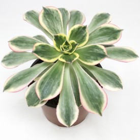 Shrub forming woody and succulent stems. Foliage variegated with cream white forming large rosettes up to 40 cm in diameter. Take pink shades in the sun. One of the most spectacular Aeonium trees. To be grown in a large pot. Adapts well in composition with plants of the same vigor.
