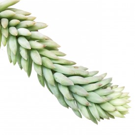 Falling plant. Green/light blue foliage. Form of very long falling clusters. ideal for suspension. Looks a lot like Sedum burrito but recognizes itself by its longer and pointed leaves.